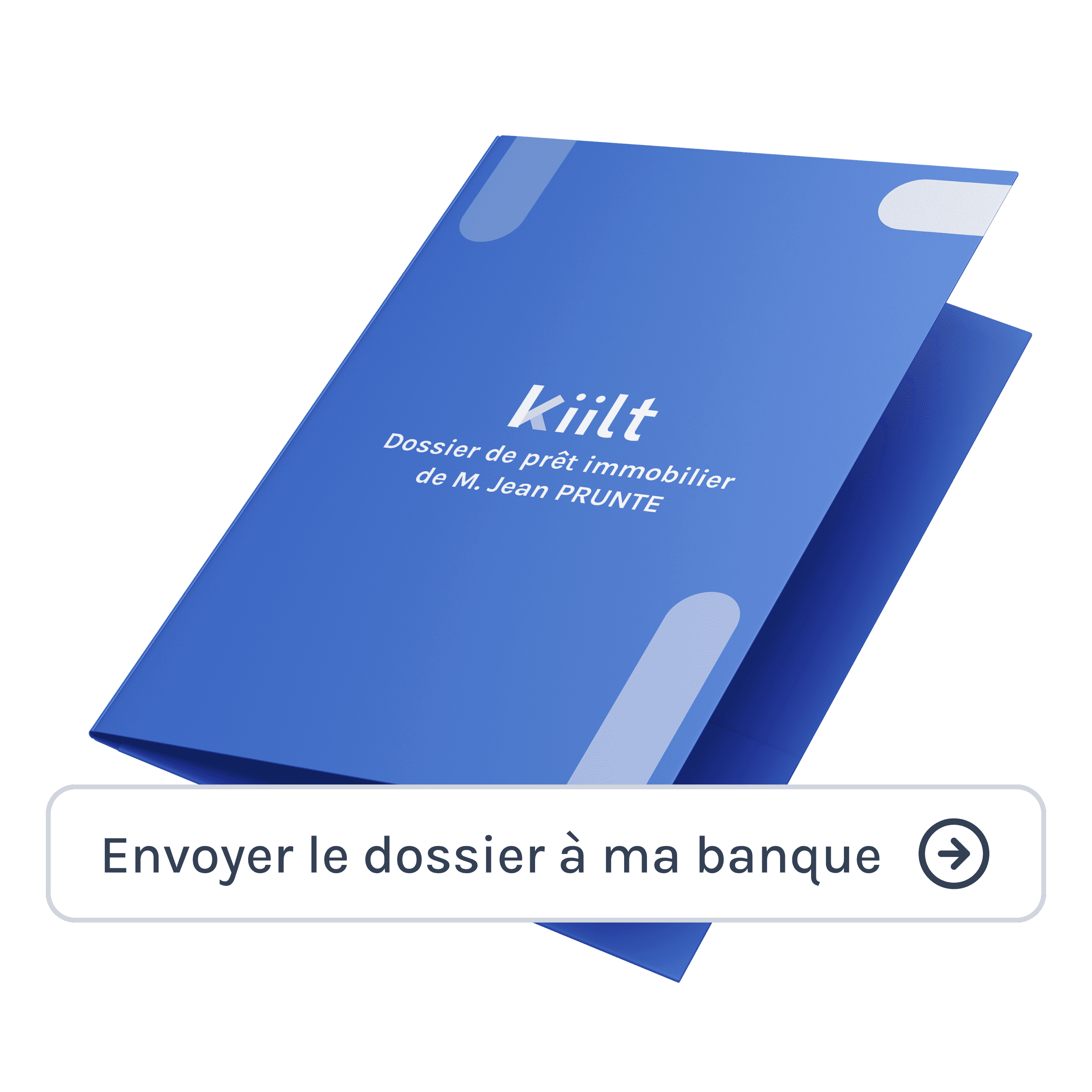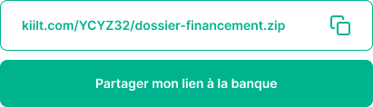 Avec Kiilt, obtenir son dossier de financement est tout aussi rapide que de le partager avec les établissements bancaires. Depuis votre espace personnel, retrouvez votre dossier complet en téléchargement direct ainsi qu’un lien de téléchargement sécurisé à transmettre aux banques.