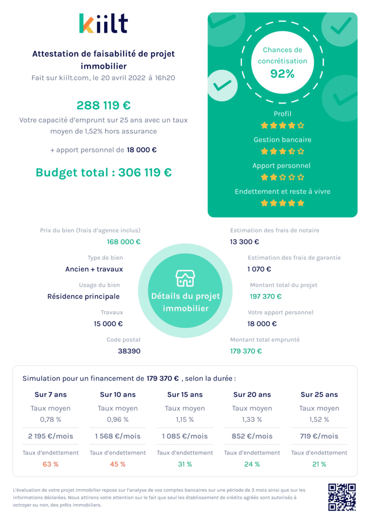 En analysant les risques potentiels, le professionnel en charge de la faisabilité de votre projet atteste que votre situation est favorable à un investissement immobilier. De ce fait, ce document est très rassurant pour les vendeurs et les agents immobiliers, bien plus qu’une simple simulation obtenue en deux clics sur internet. C’est pourquoi il est préférable d’obtenir ce document le plus tôt possible, avant les visites de préférence.